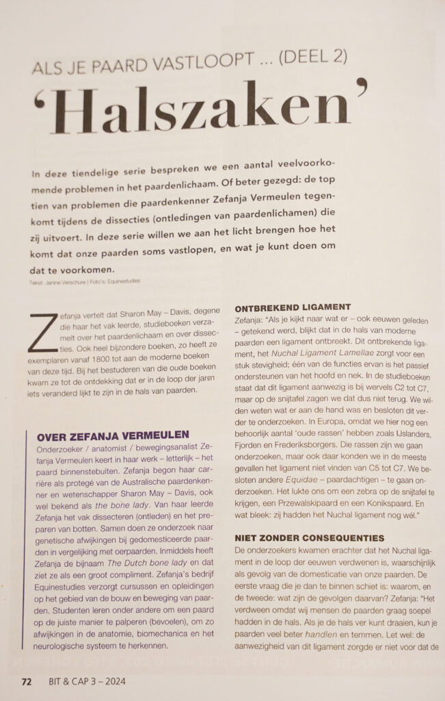 Voor BIT & CAP mocht Zefanja haar kennis delen over een onderwerp dat in de paardenwereld vaak onderschat wordt: problemen in de hals. In dit artikel vertelt ze hoe anatomische variaties, het ontbreken van het Nuchal ligament en moderne managementkeuzes kunnen bijdragen aan vastlopers in de hals én vooral wat je als eigenaar kunt doen om deze problemen te herkennen en te voorkomen. Lees het volledige artikel hieronder.